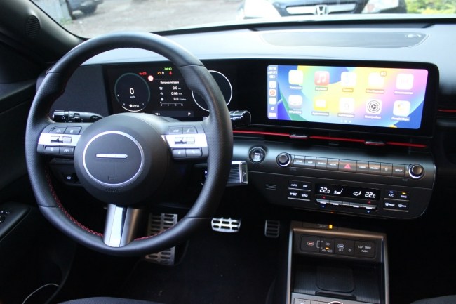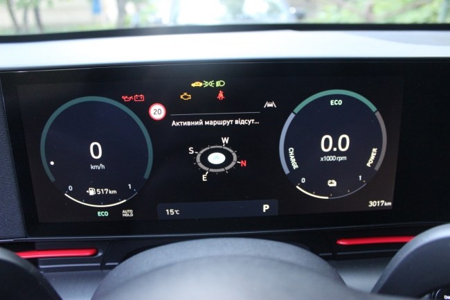 Салон героя нашого тесту оформлений у дусі електромобіля Hyundai Ioniq 5. На передній панелі водій знайде об'єднані екрани цифрової панелі приладів та медіасистеми діагоналлю 12,3 дюйми кожен.